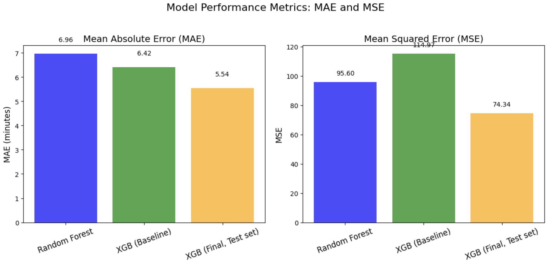 We were able to achieved a Mean Absolute Error (MAE) of 5.54 and Mean Squared Error (MSE) of 74.34 in flight delay prediction using Random Forest Regressor, explaining 95% of target variability (R² = 0.95)